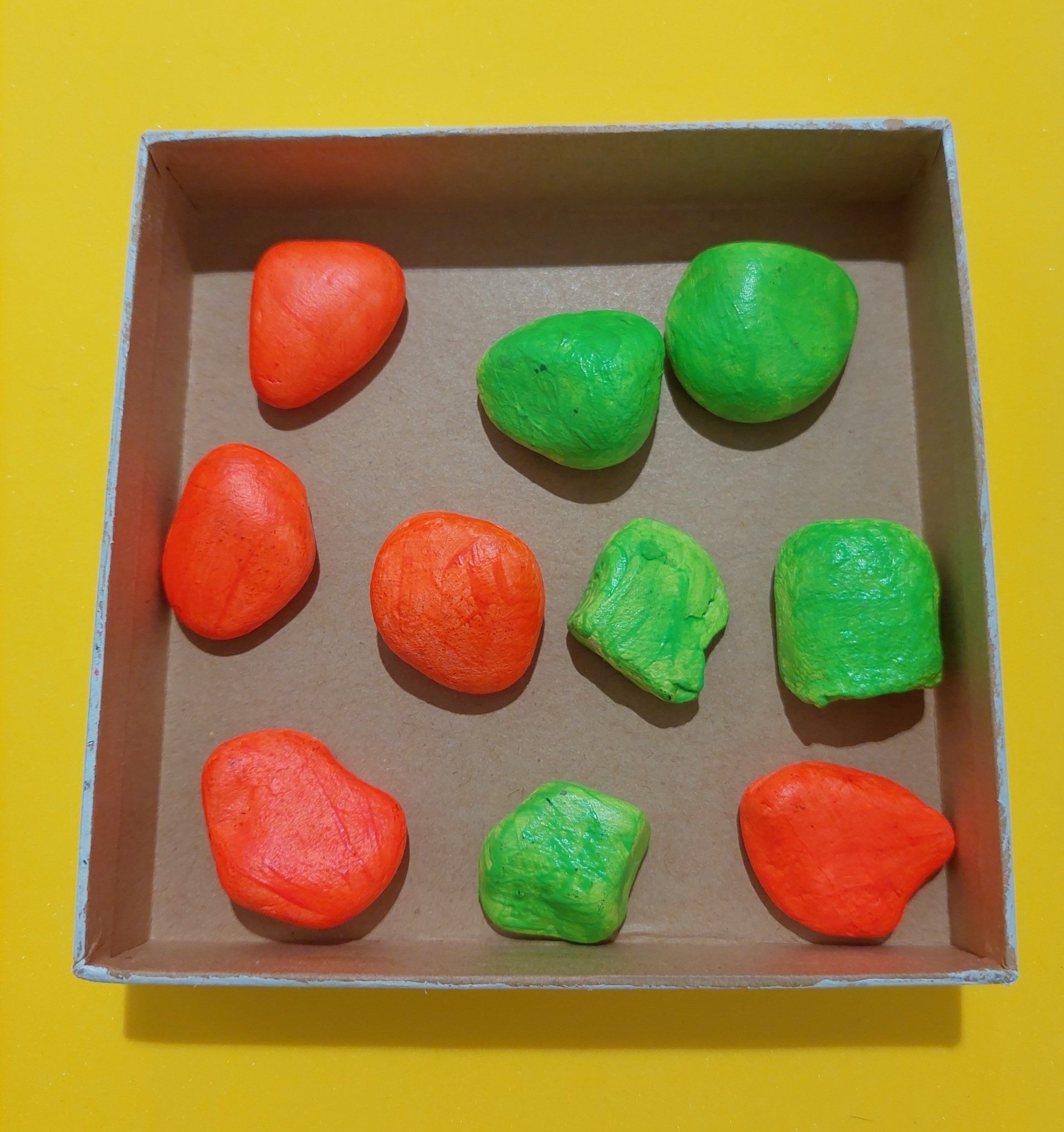 Material: Steine ( gewaschen und getrocknet), Acrylfarben wetterfest, passende Schachtel, Lineal, Permanentmarker und einen Pinsel zum auftragen...