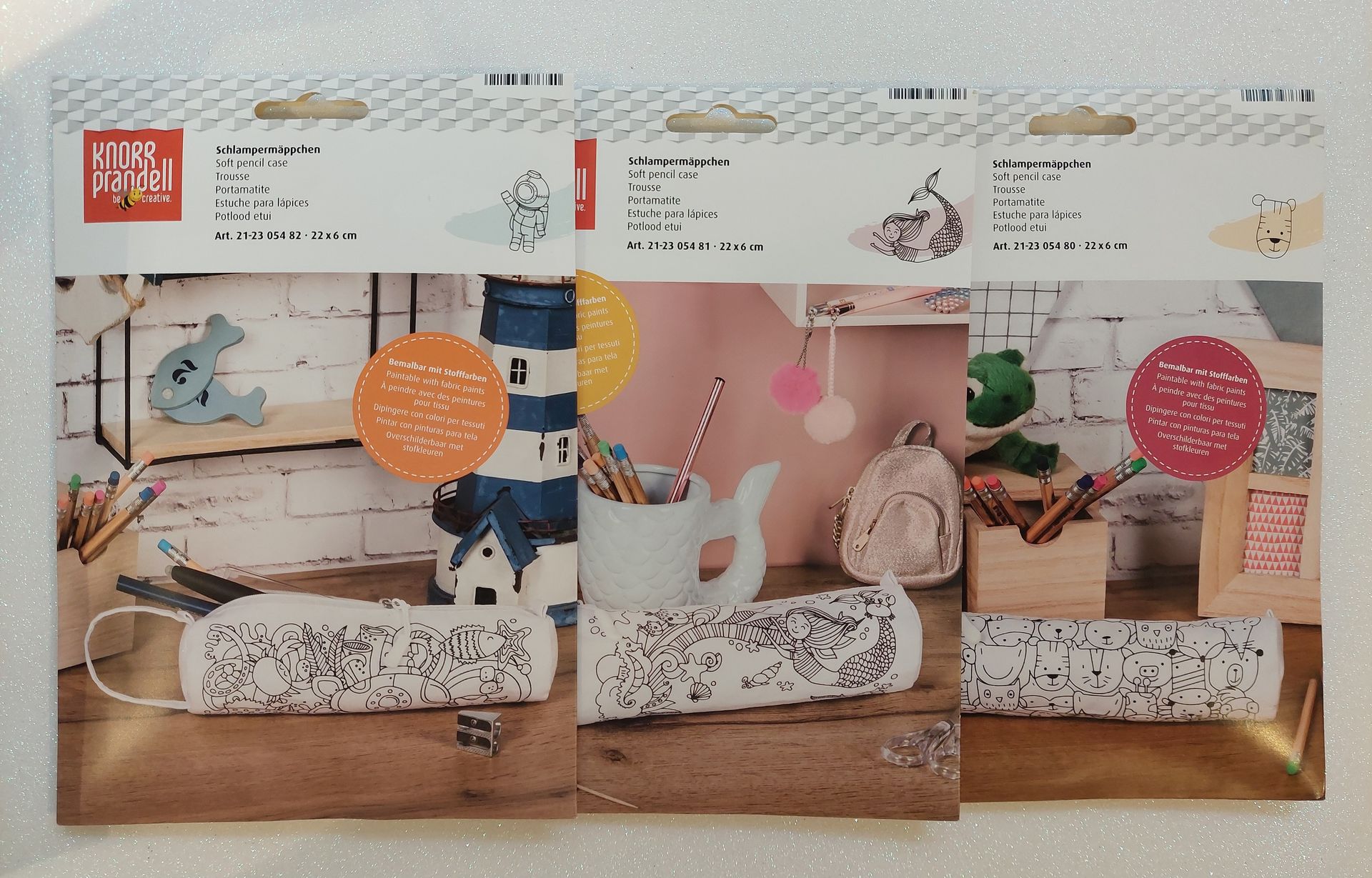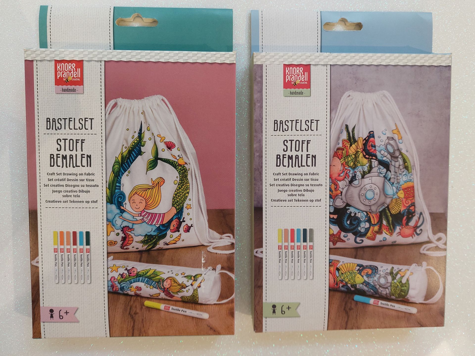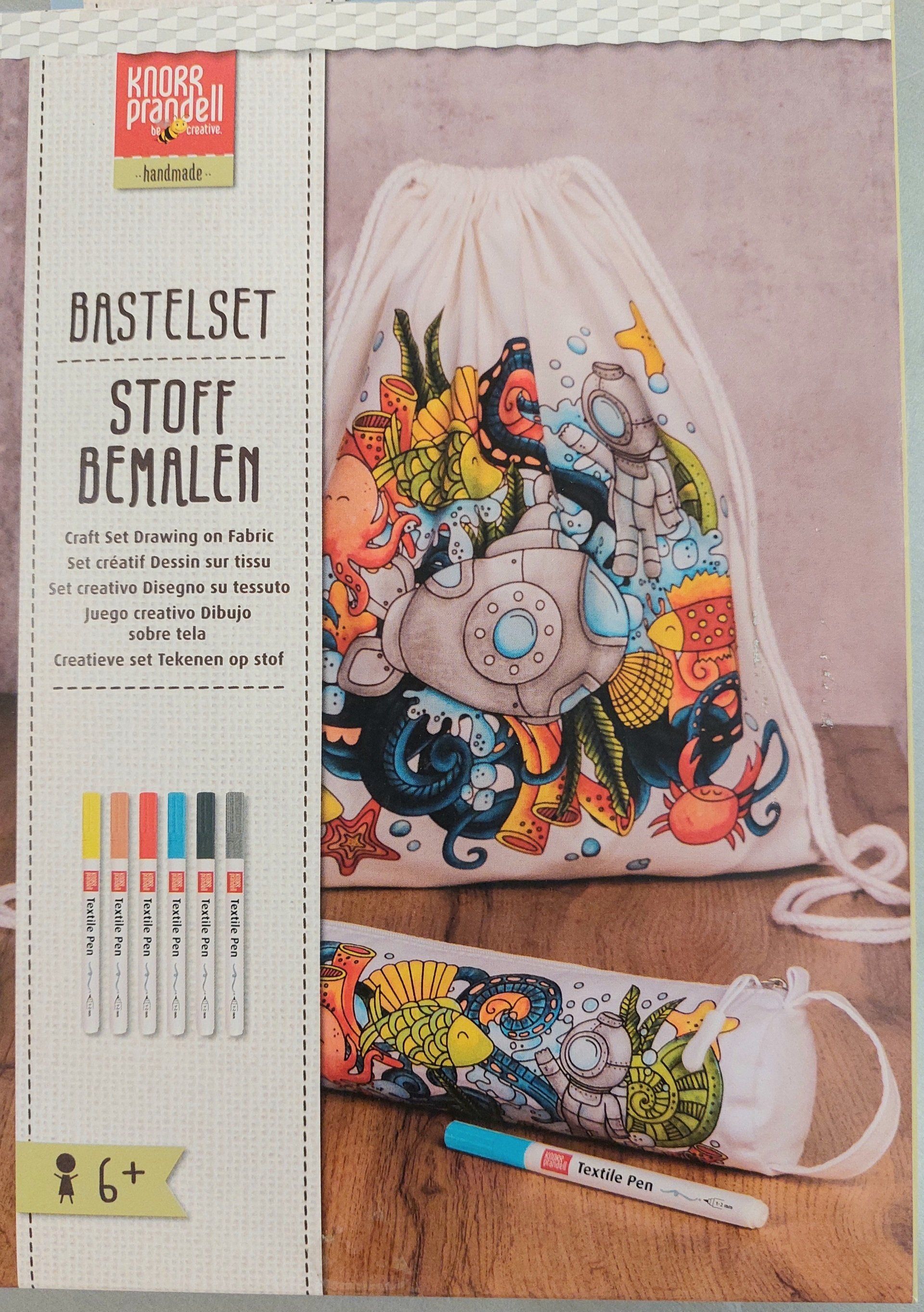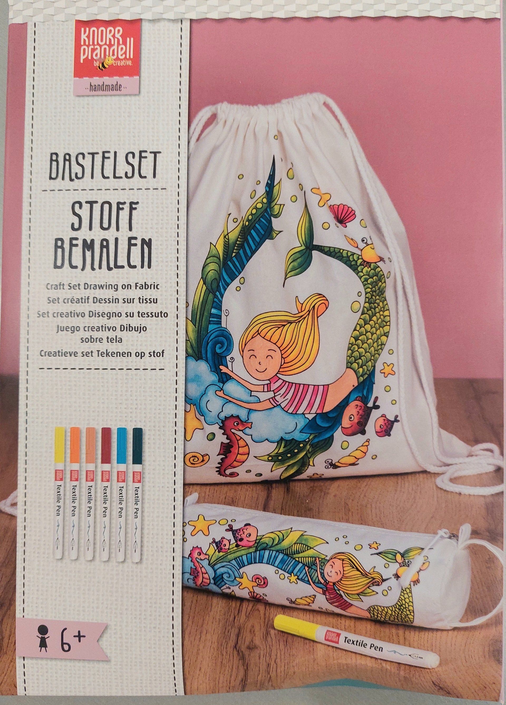 Unser Sets gibts in zwei verschieden Varianten samt Stoffmalstiften und kleinem Federpenal