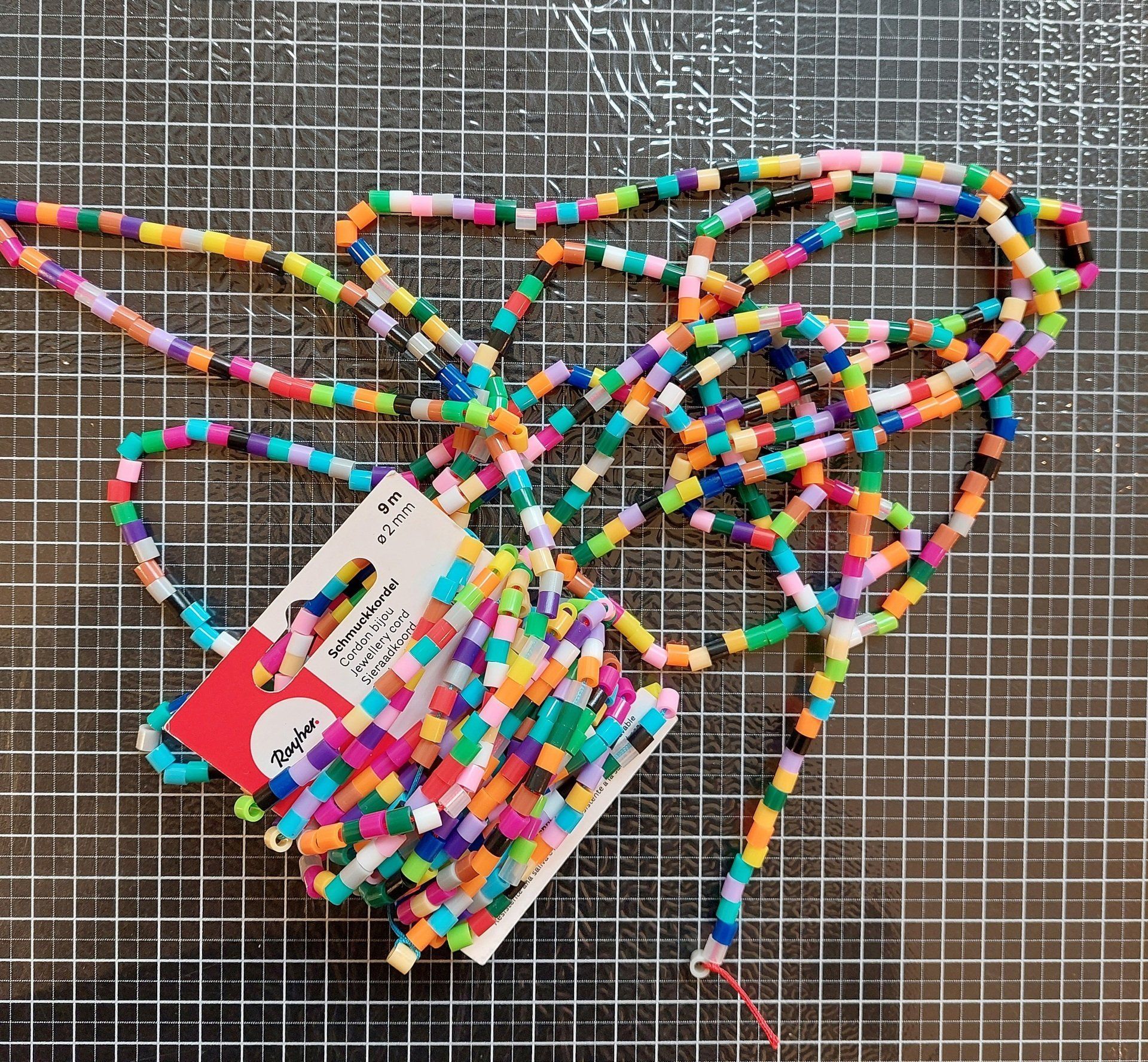 Eine gaaaanz lange Schnur mit Bügelperlen auffädeln und dann mit Alleskleber Reihe für Reihe auf ein Glas aufkleben.