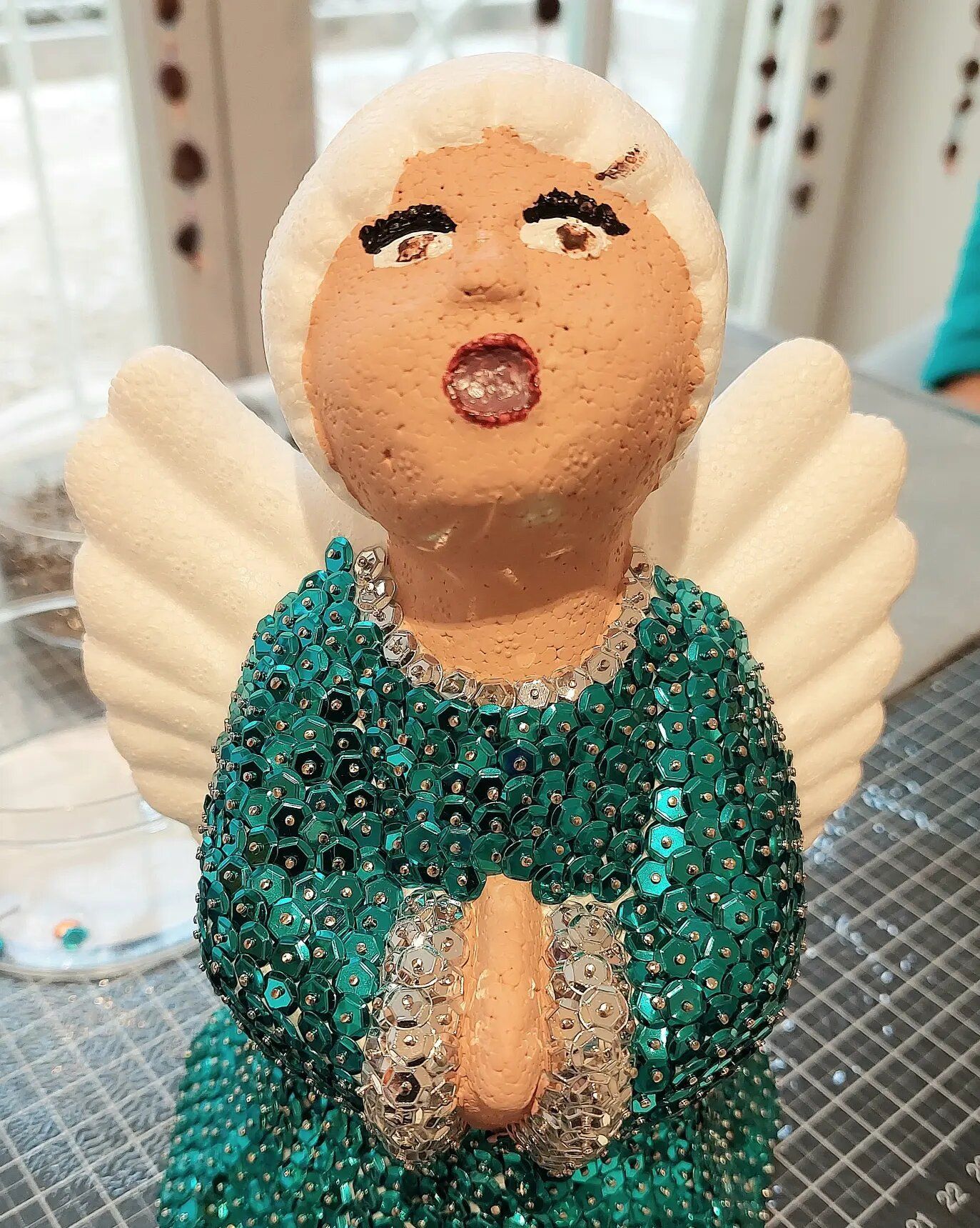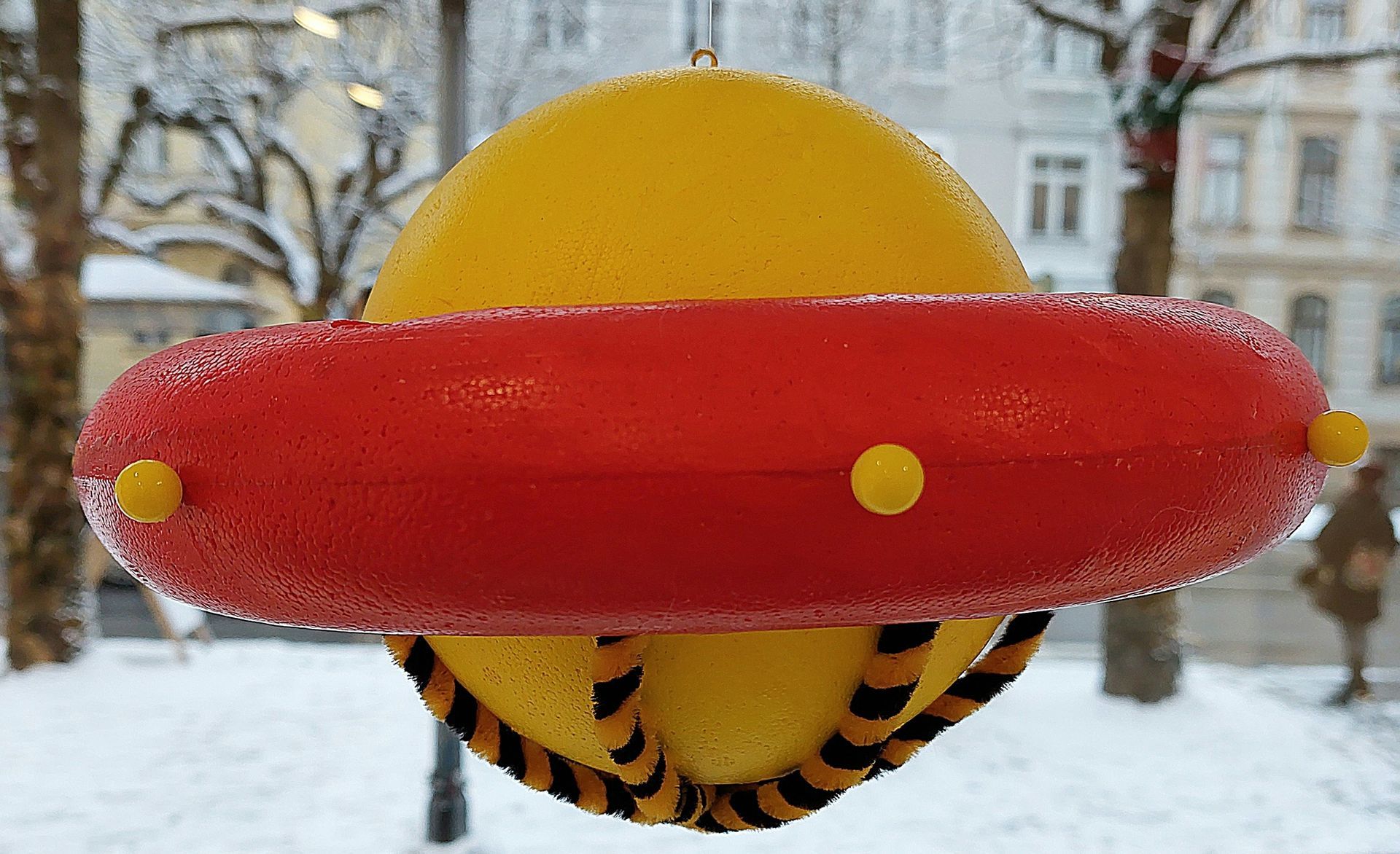 Material: Styroporkugel, Styroporring,Acrylfarben, Pfeiffenputzer und bunte Pinwandnägel