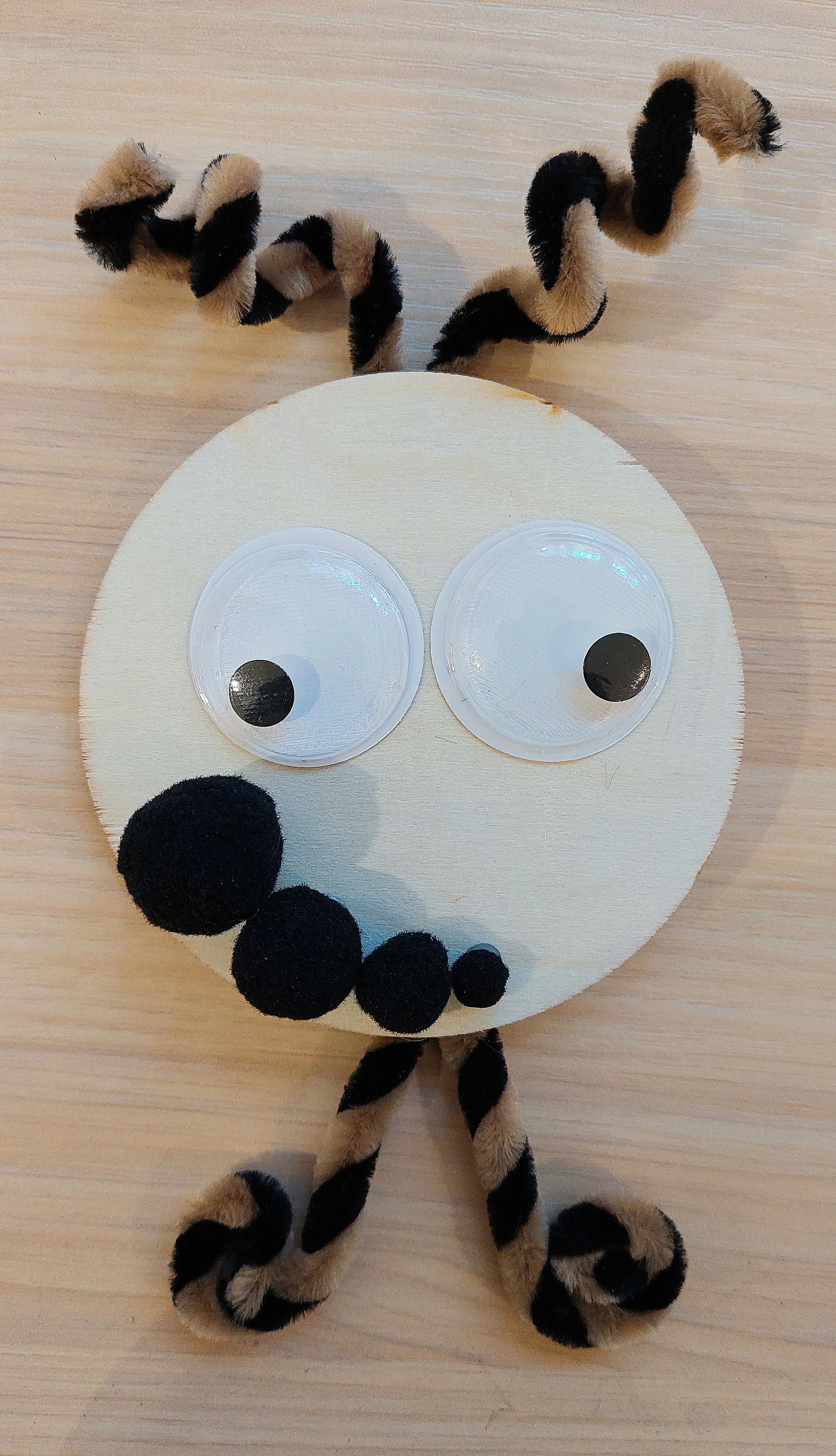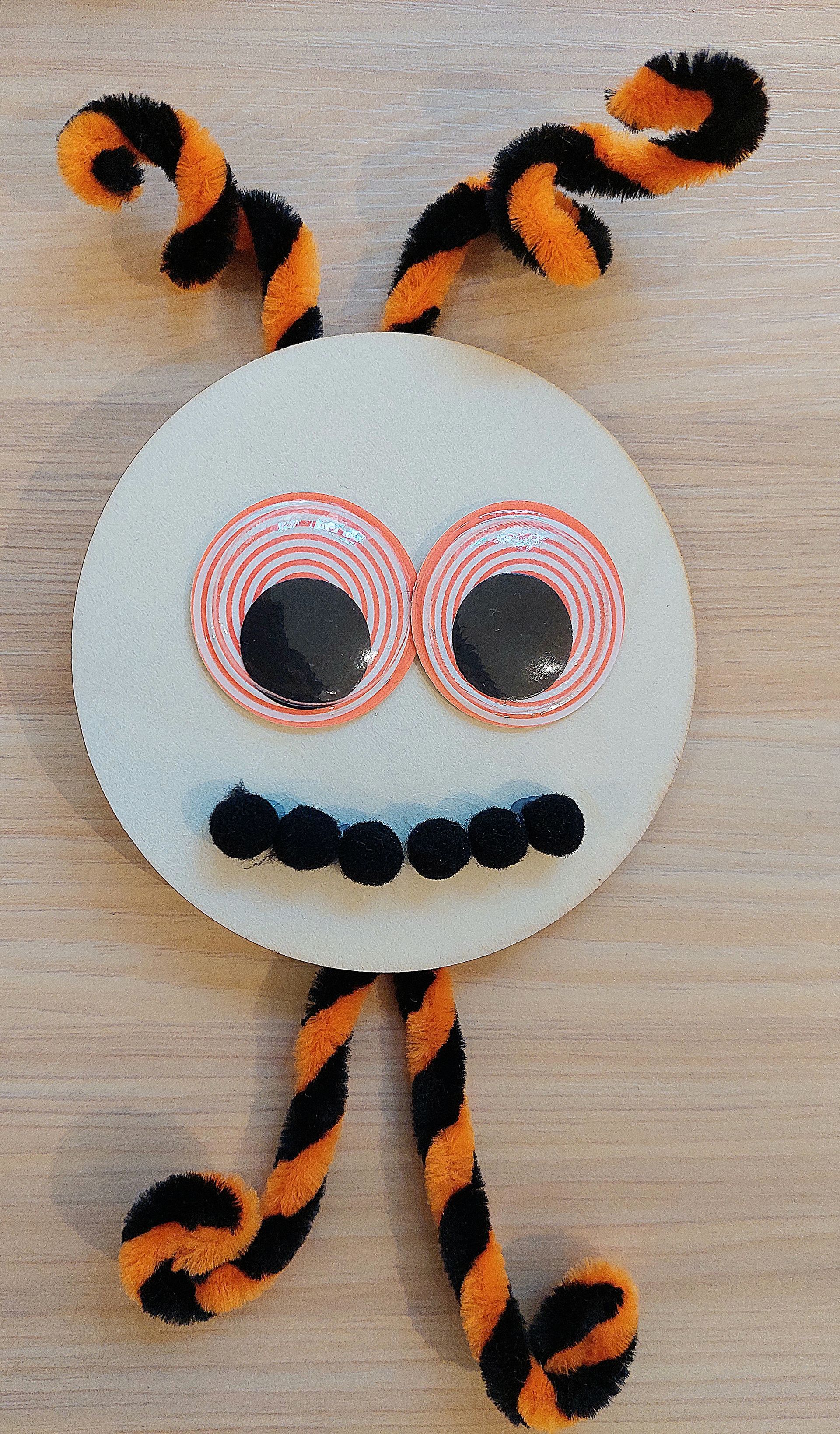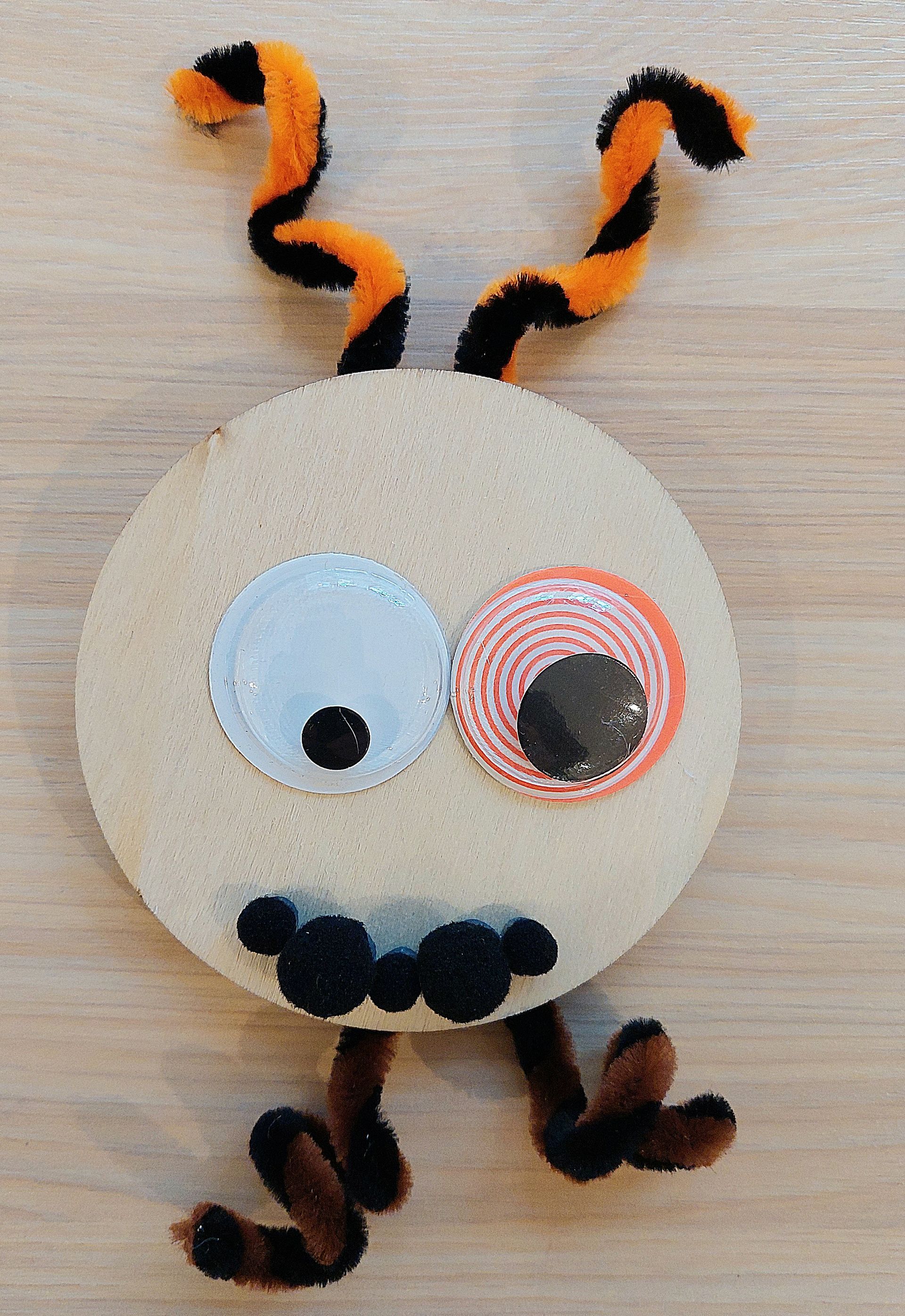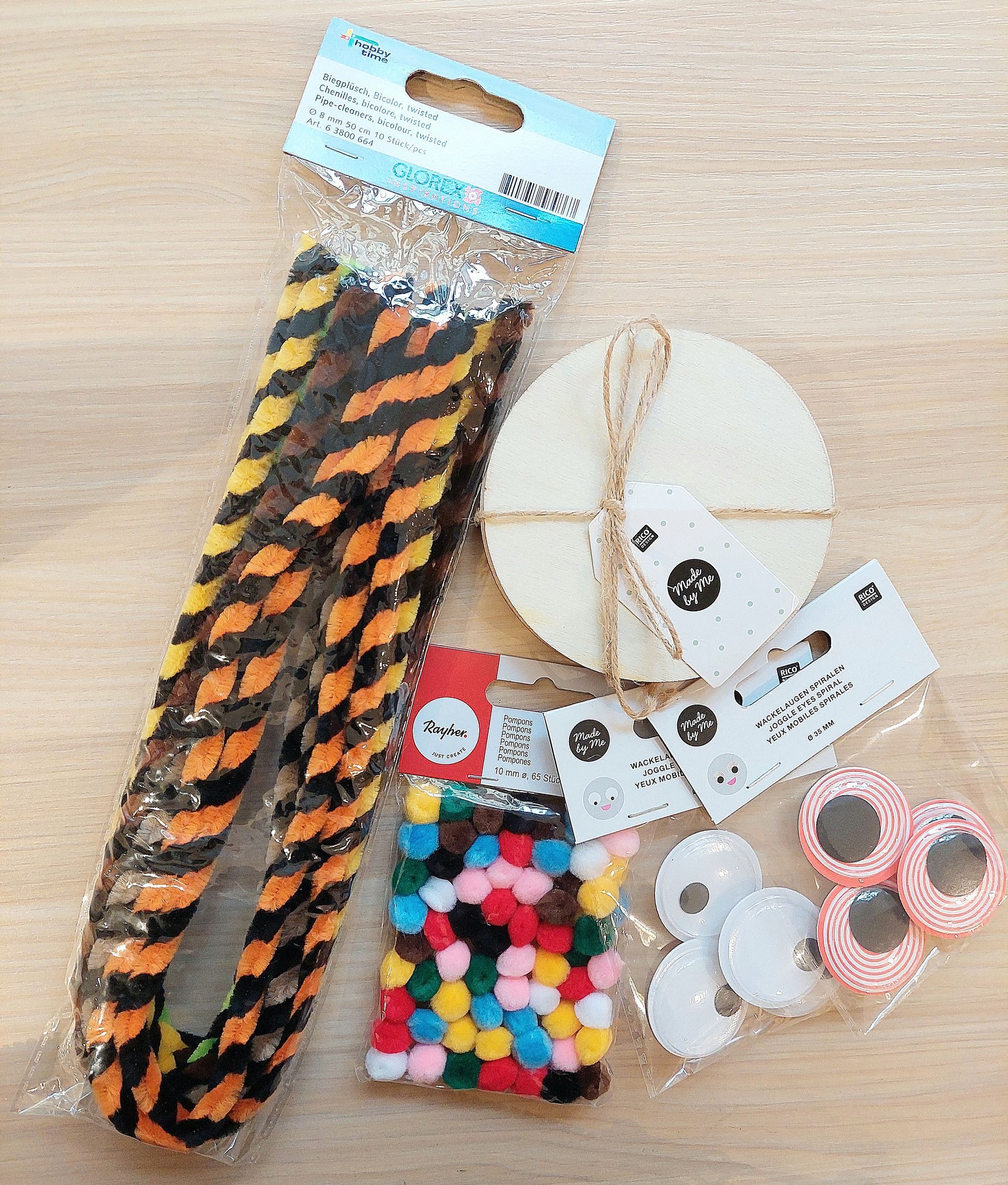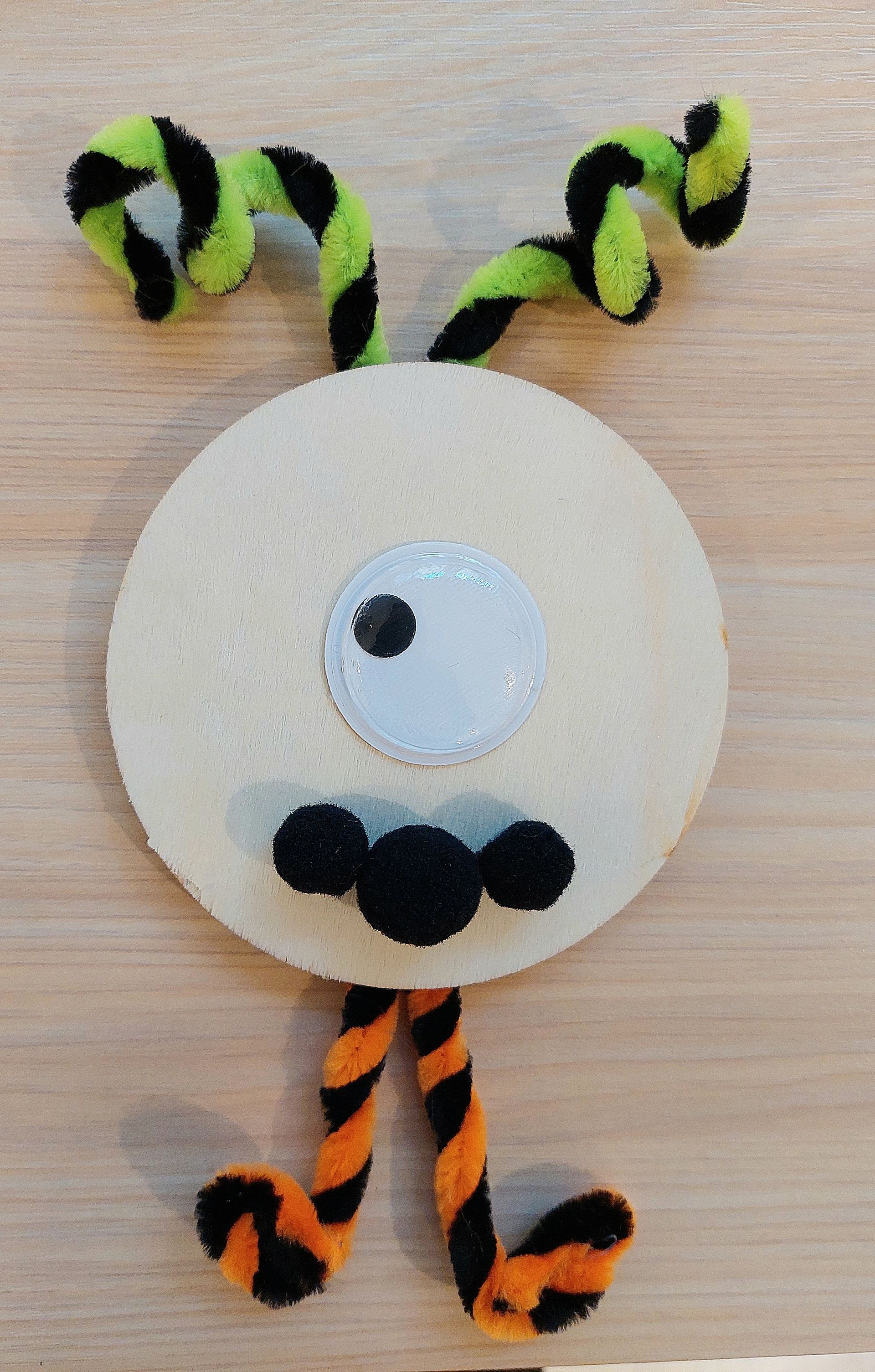 Wir sind die Selfmade Monster, wir sind aus einem runden Holzuntersetzer , unsere Haare und Füße sind aus Pfeiffenputzer, der Mund ist aus den Pompons und als Augen gibt es ganz große Wackelaugen.