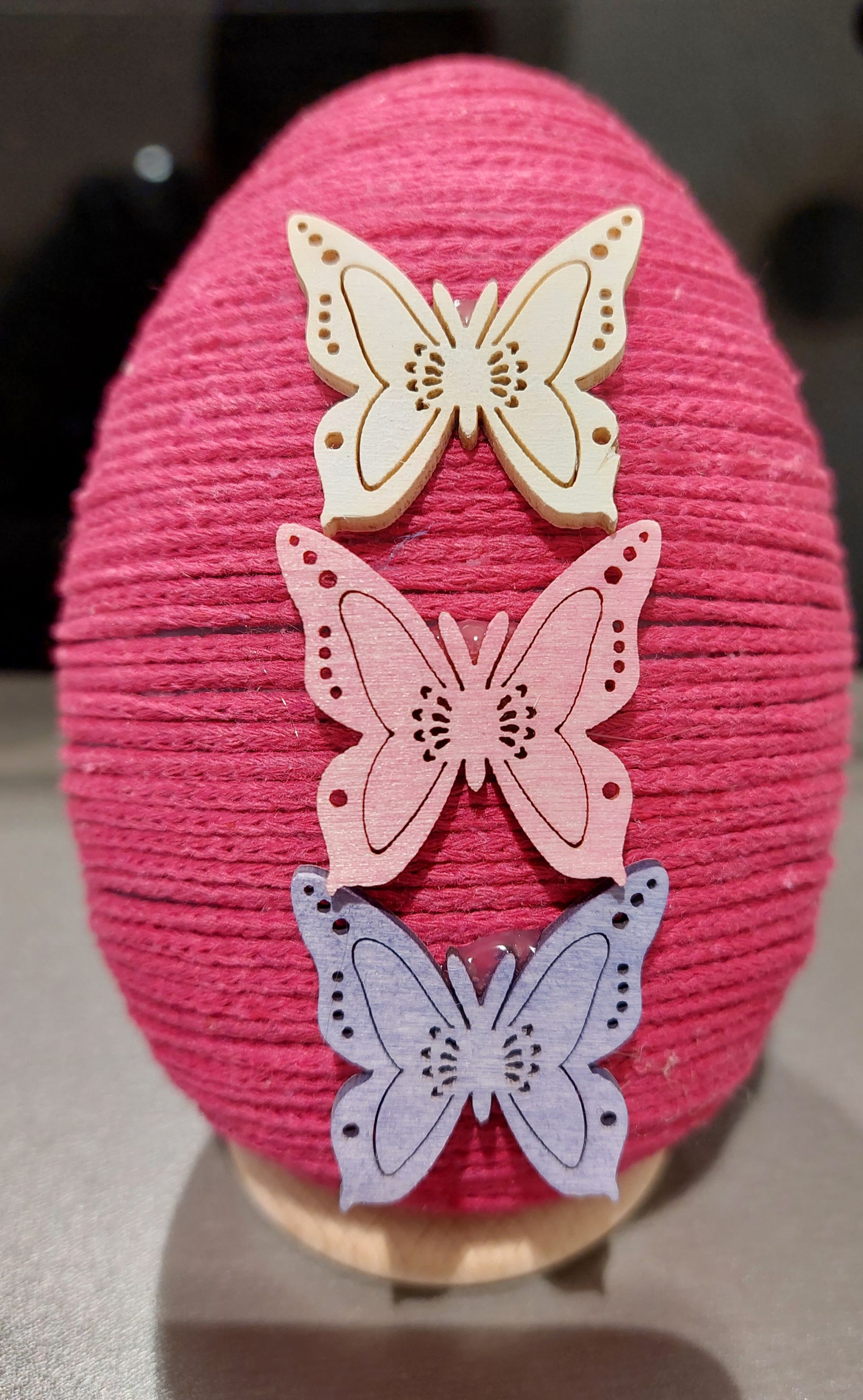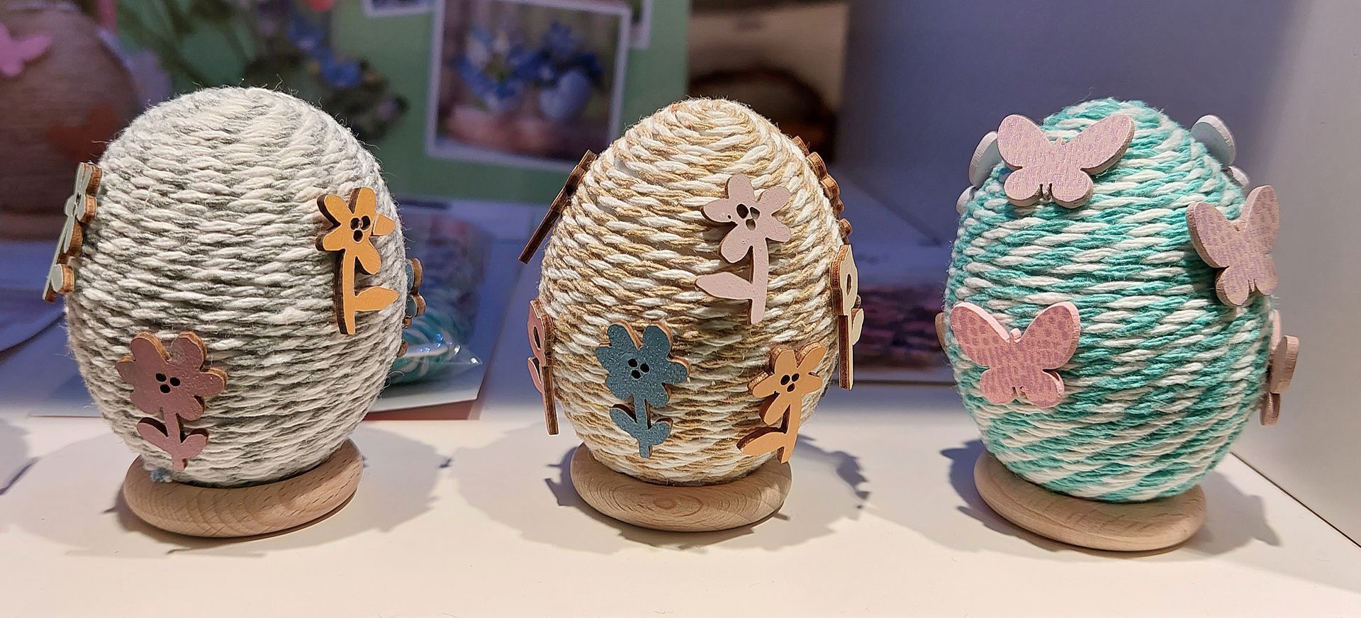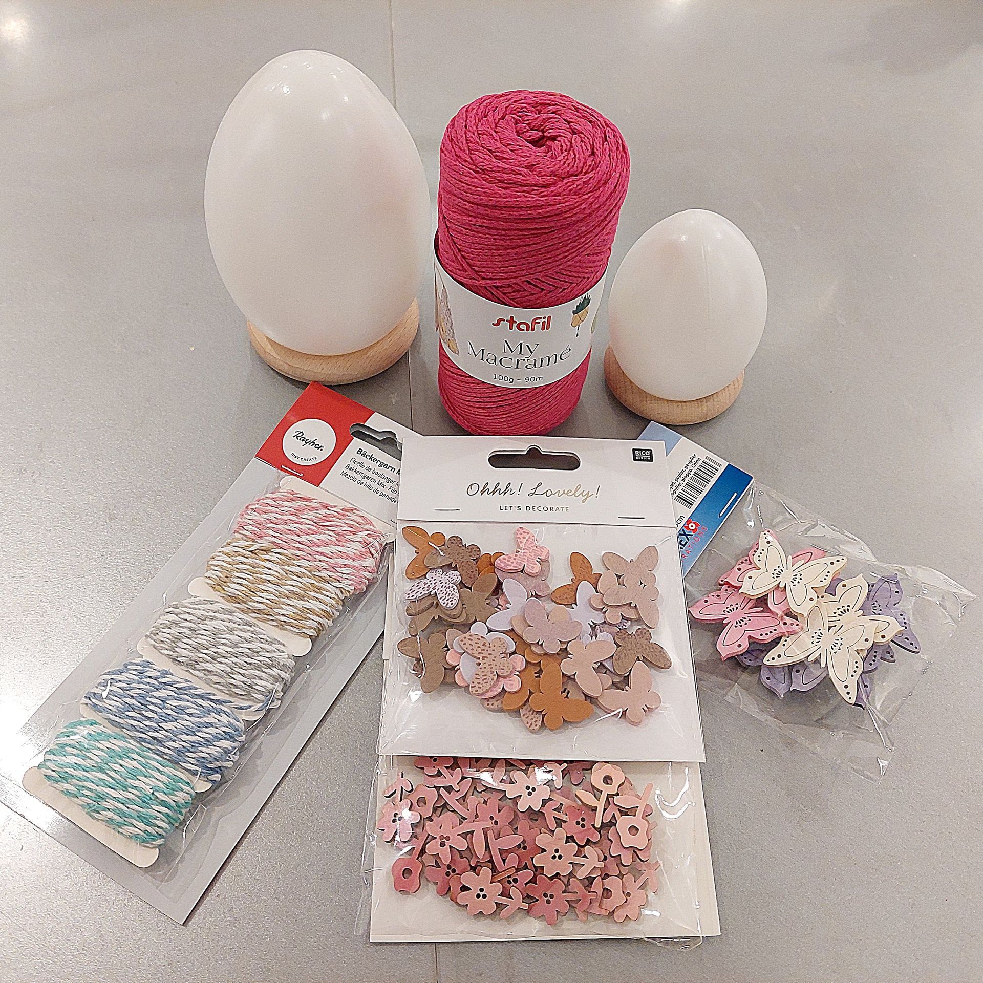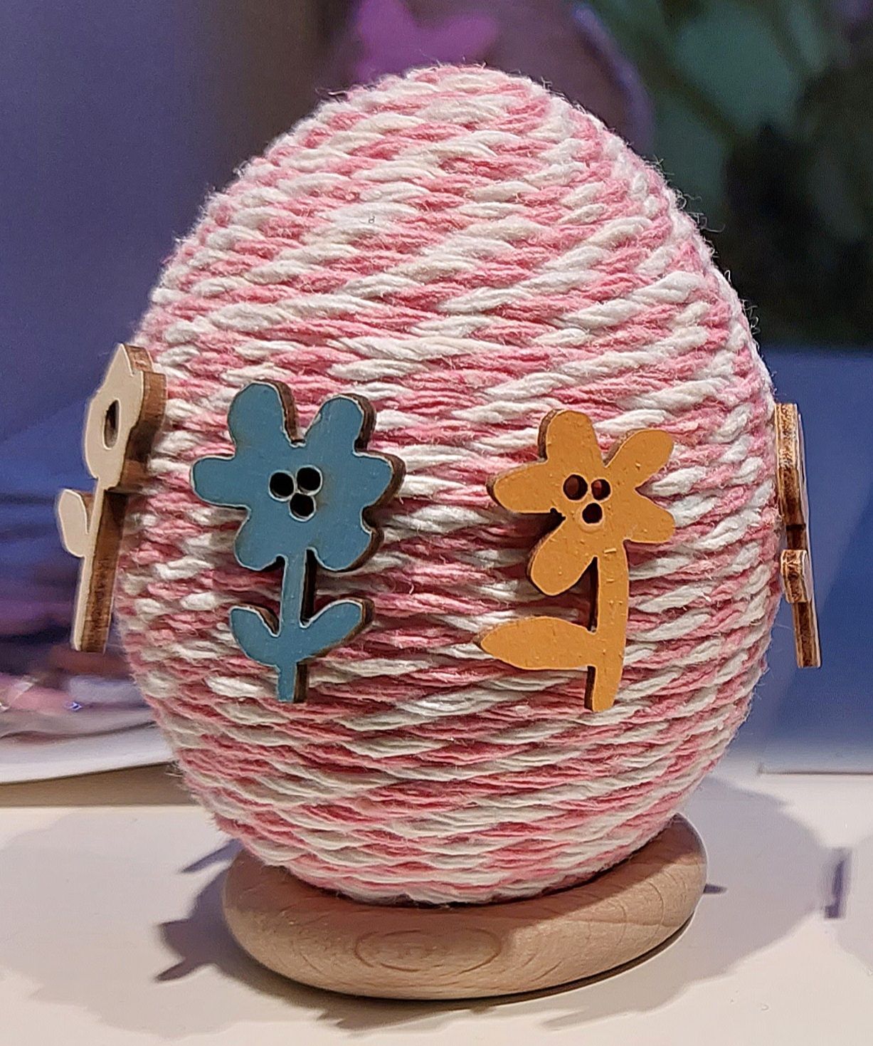 Material: Makrameegarn, Bäckergarn, Plastikeier, Bastelkleber und Holzstreuteile...