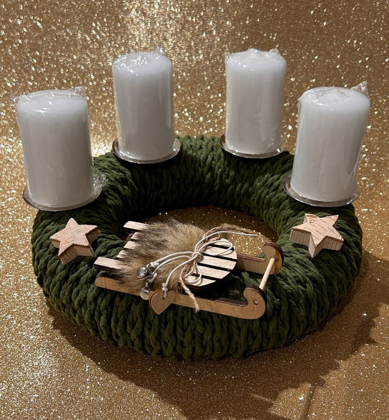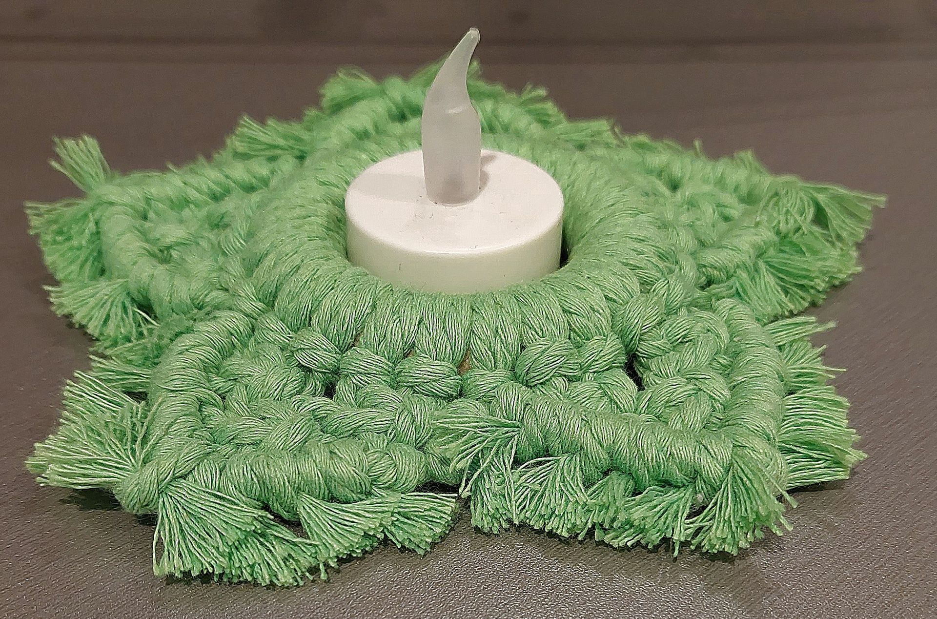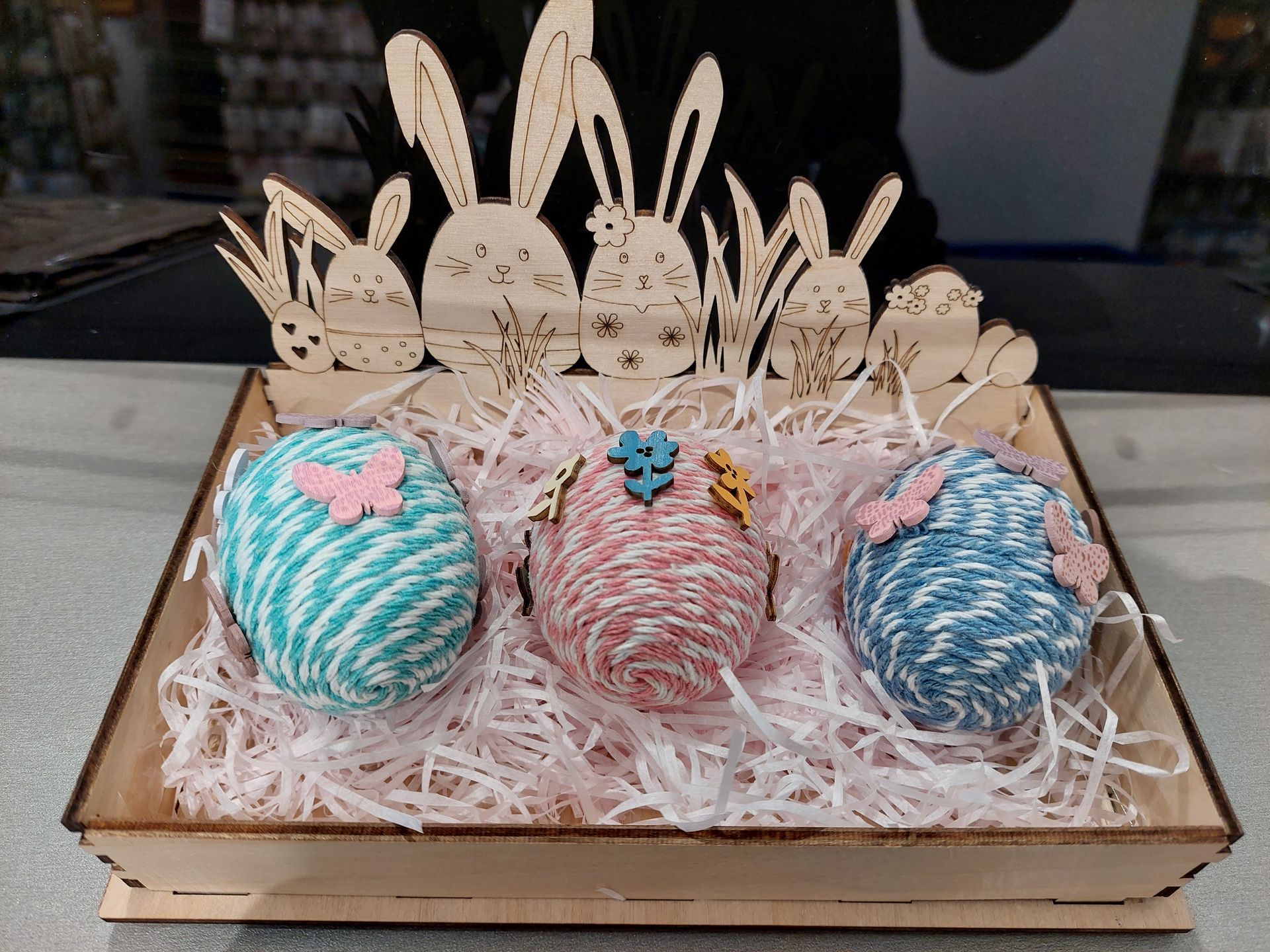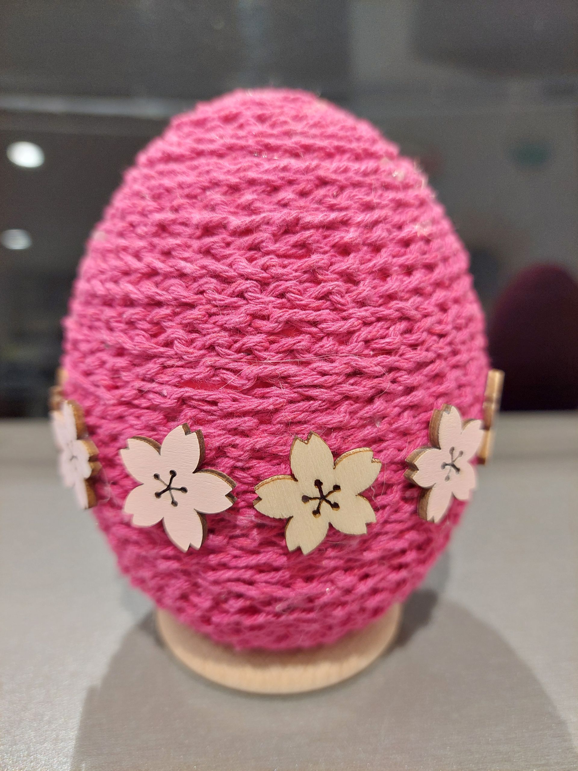 Material: Makrameegarn, Bäckergarn, Plastikeier, Bastelkleber und Holzstreuteile...