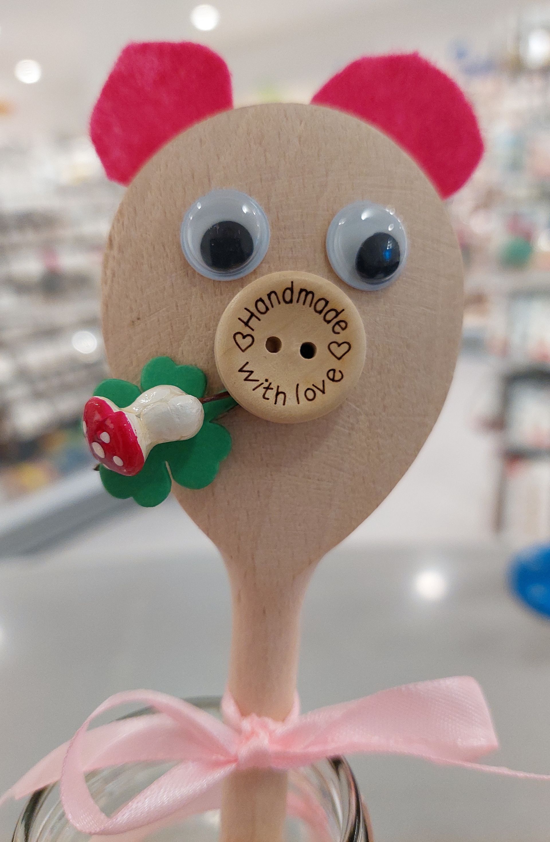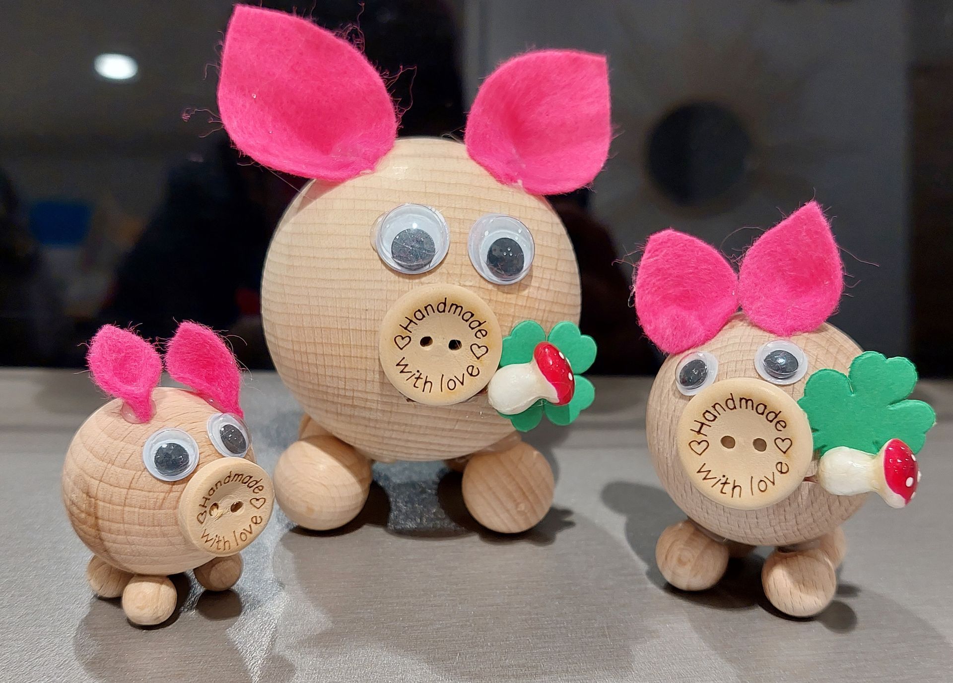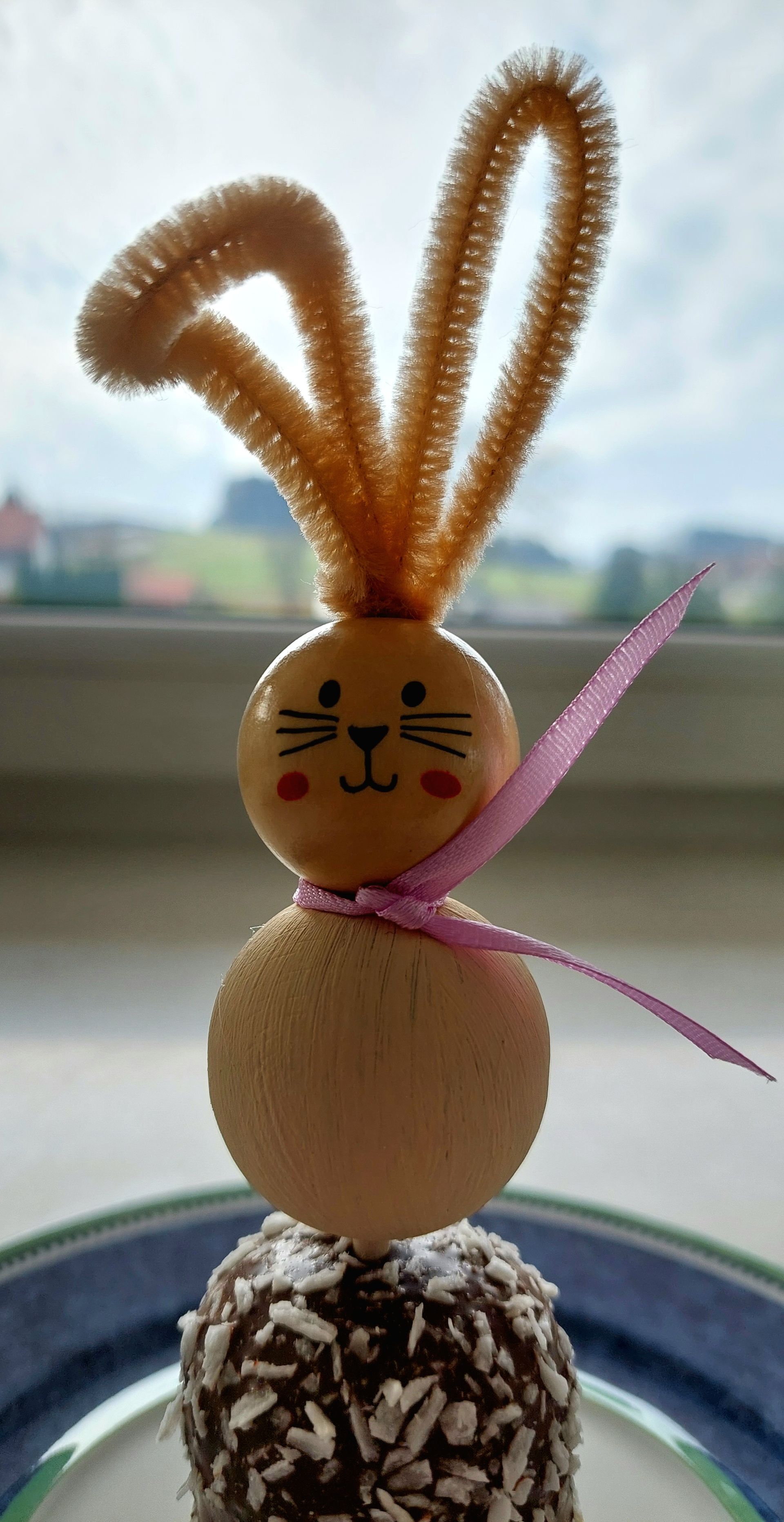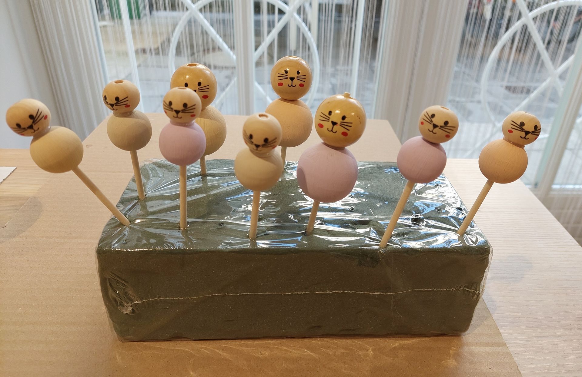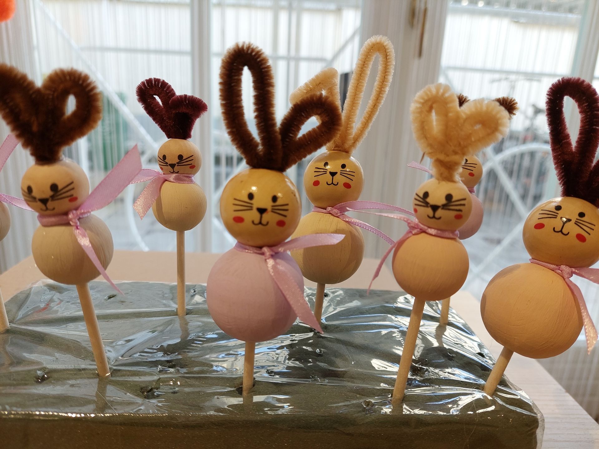 Material: Holzkugeln, Holzkugeln mit Hasengesicht, Holzstäbchen, Pfeiffenputzer, Kleber, Acrylfarben, Satinband und Süßigkeiten zum reinstecken.