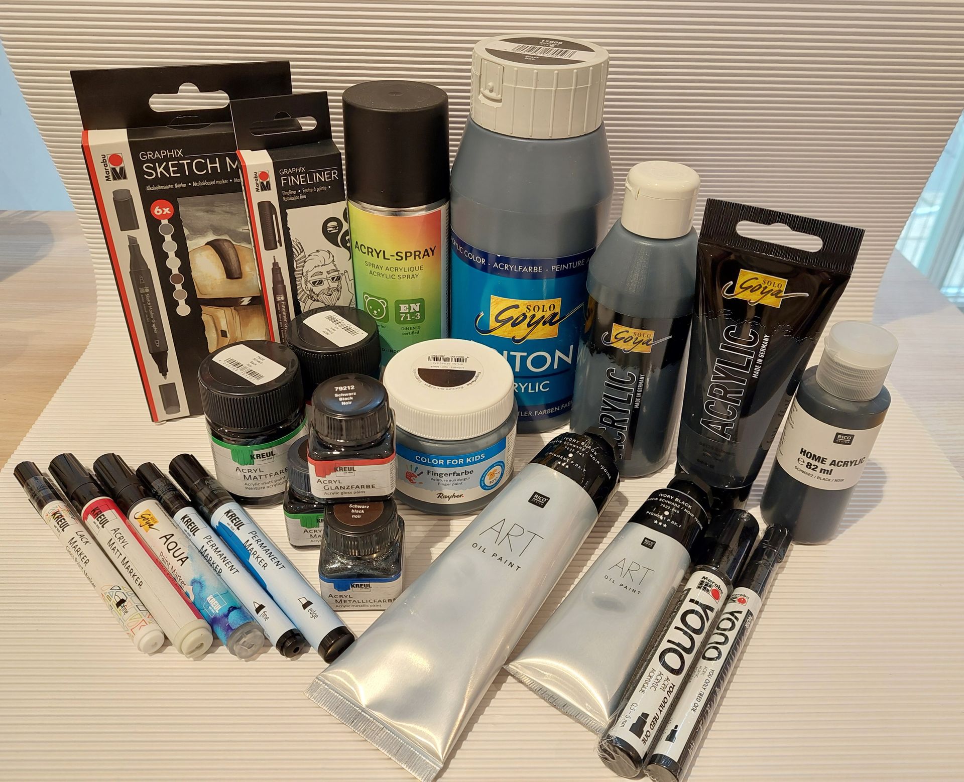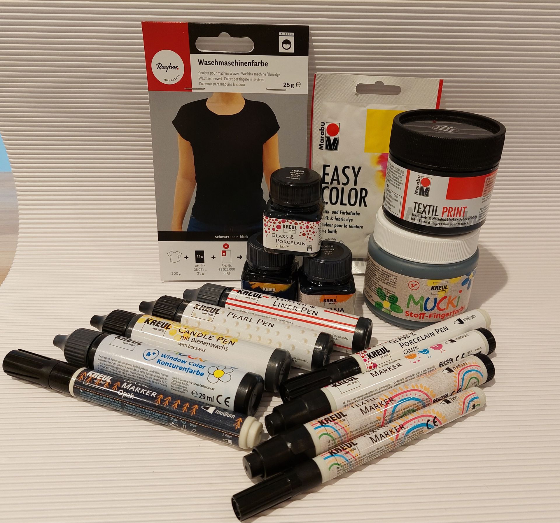 Wir führen ein großes Sortiment an Farben, zum Beispiel den Farbton schwarz gibt es als Acrylfarbe- glänzend, matt, metallic, in Künstlerqualität, als Marker und