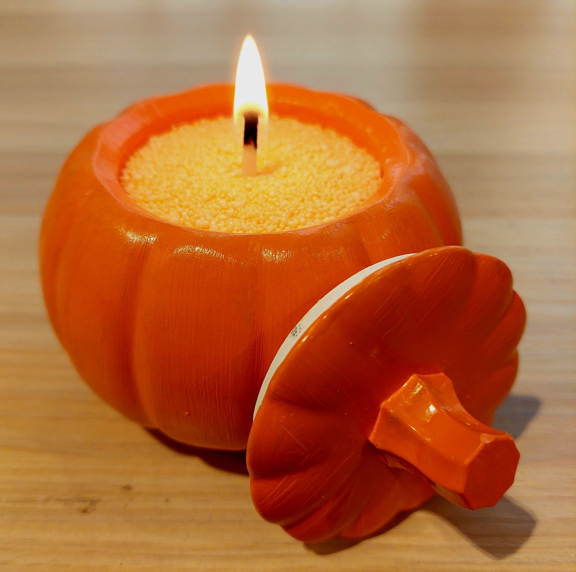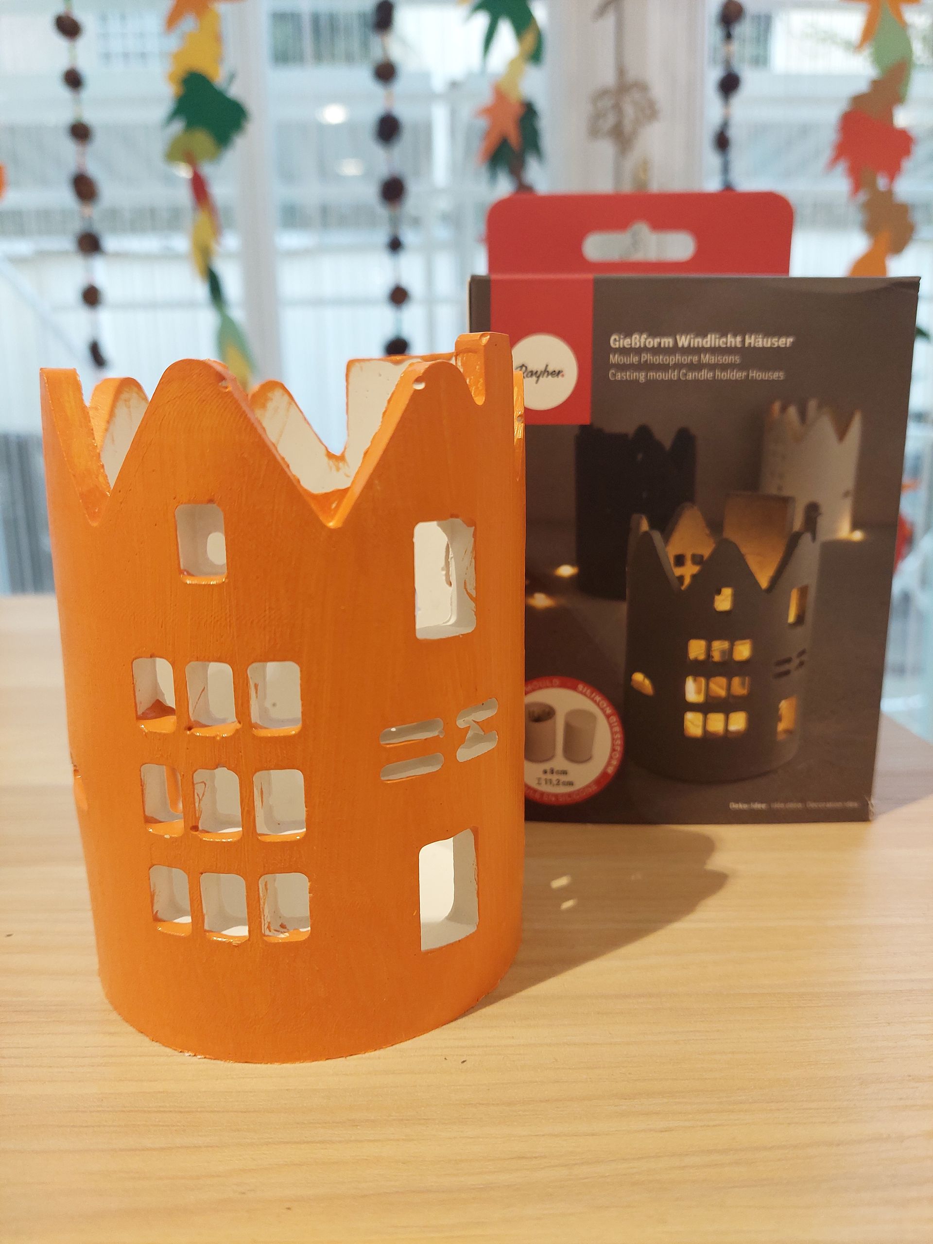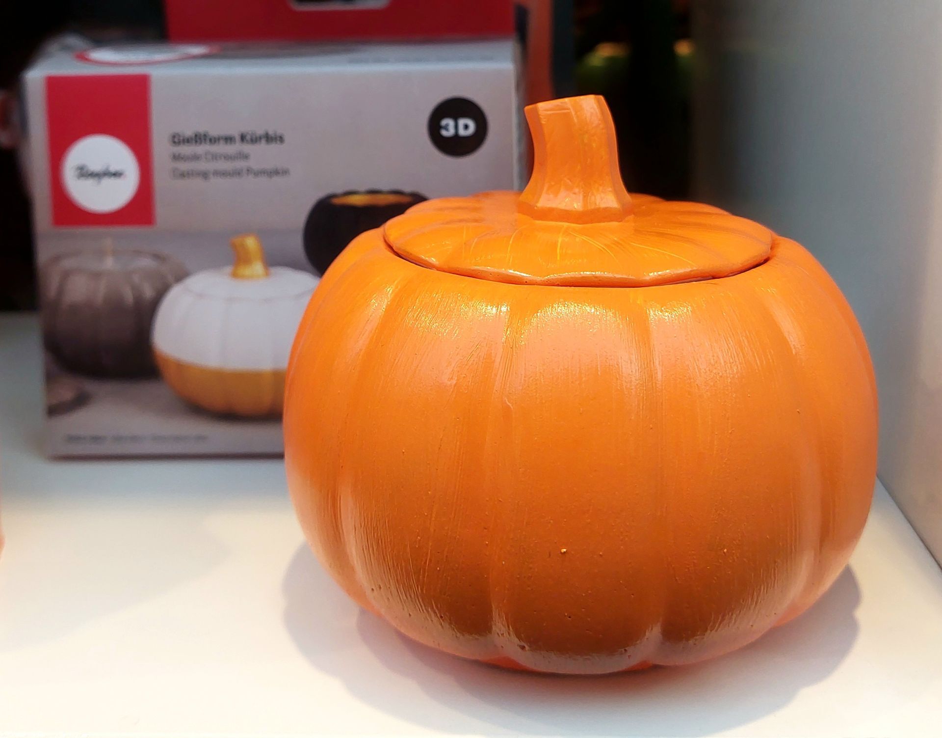 Die Silikonform Kürbis einfach mit Gießpulver befüllen, aushärten lassen, entformen, bemalen, mit Kerzensand befüllen- Docht reinstecken- fertig!