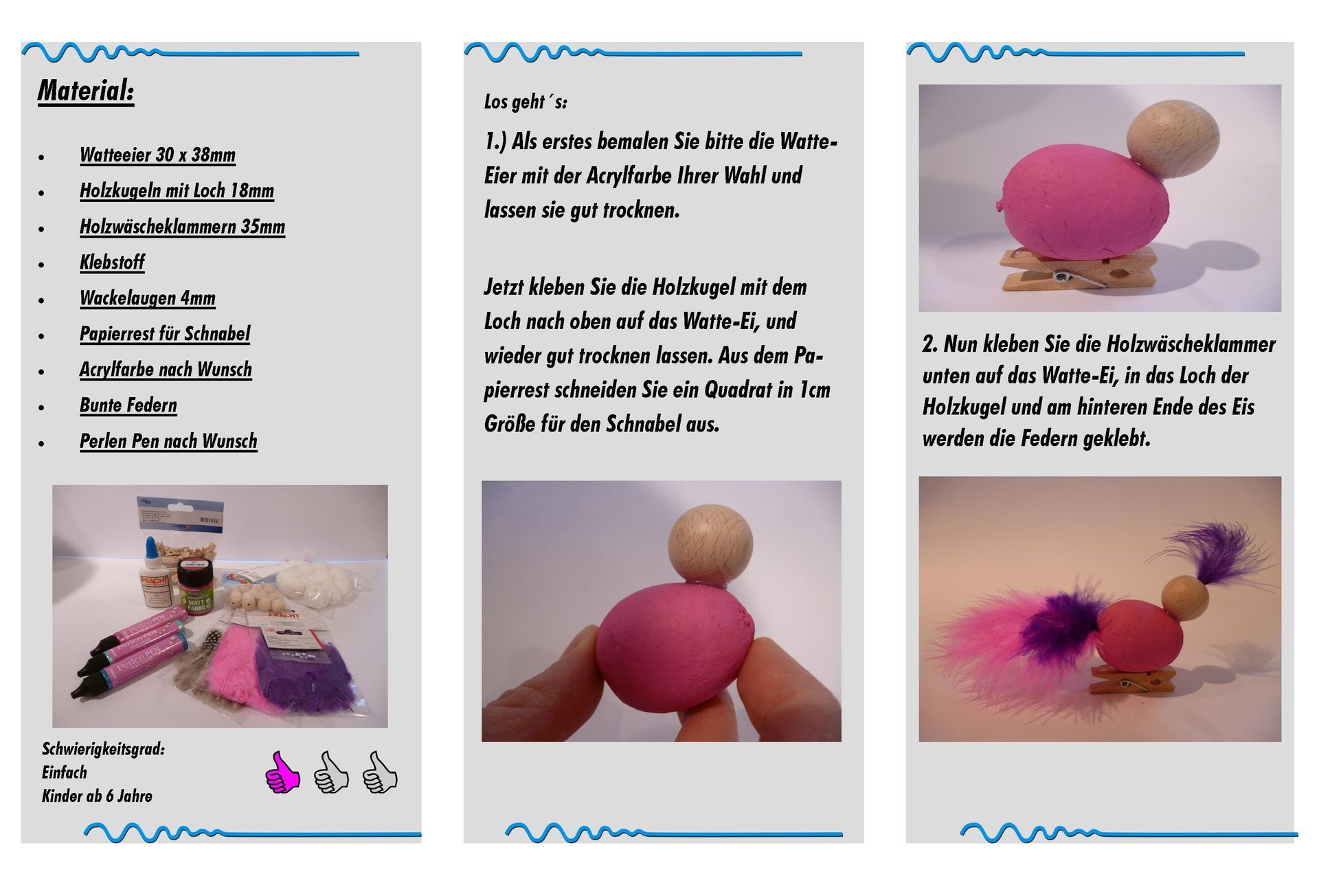 Wir sind kunterbunte Vogerl aus Watteeiern, Holzkugeln und Federn...